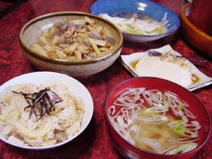 美味しい筍を、ご近所さんに頂いたので、今日の夕飯は、筍づくしの日。 筍の刺身,筍ご飯,筍お吸い物,筍のお煮しめを作った。 にがり&豆乳で、豆腐を作ったり、白菜とミョウガの漬け物を漬けたり、 蒸しケーキを作ったりして、台所で半日過ごした。 実は、私は、料理が好きだったりするんです。(意外?)