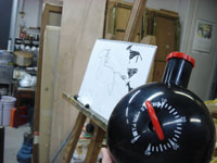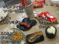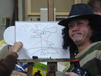【おめれとぉ〜】 2005.01.01 さて。年明けも引き続きえりすで。宴会。 この会場は、絵画教室のアトリエ。 ってことで、企画してみた、 『新春!お絵かき ジェスチャーゲーム!』 ![]() お題を出されたら、スタートの合図とともに、 スケッチブックに、その絵を描く。 手元には、40秒で爆発する爆弾があって、 爆発する前に、その絵が何なのかをみんなに当ててもらう。 というルール。 みなさんの豊かな才能が発揮された時間でした(爆) 翼のクワガタが一番上手だったということは、 誰もが心の中で認めたことでしょう。(笑)