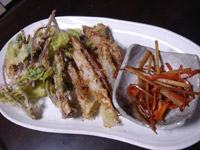 【山の幸♪】 2005.05.16![]() 家に帰ってきたら、台所に長〜い植物が、置いてあった(爆) どうやらそれは、「山うど」っぽい。 ”うど” といえば、てんぷらか!? 葉っぱの部分はそのまま、茎の部分は皮をむいて、てんぷらに♪ 硬そうなところは、にんじんと一緒に、きんぴらにしました。 おいしかった!!!! 海の幸も、山の幸も、簡単に手に入る日立って最高! |