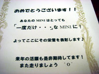 【エムズツーリング♪】 2005.05.22![]() ![]() エムズツーリングに参加してきました〜 一体何十台のミニが集まったんだろう!?数えきれませーん(笑) 色とりどりのミニもきれいだったけど、筑波山の緑たちもきれいだったよ。 ![]() ![]() 参加者投票の賞があるんだけど、 エミリーマンは、「一度だけ・・・なミニ賞」を頂きました♪うれちぃ〜 ![]() ![]() 「ミニプラス」という雑誌の取材も受けました!発売はいつなのかしらねん? ![]() ![]() エムズさん&ミニ&みんなのおかげで楽しい休日を 過ごすことができました、ありがとう☆ 【ツーリングレポはコチラ】 |