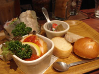 【トーマスカフェ】 2005.05.28![]() ![]() 県庁近くにある、お洒落なお店です。 デリ形式で好きなものを選べます。出てくる料理も店の雰囲気もオシャレ! アジアン料理もあって、フォーや生春巻きなんかもgoodです。 |