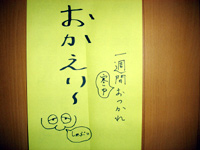 【ただいまぁ】 2006.1.27![]() 家に着いたらドアにこんなのが貼ってあった(笑) ![]() ![]() ![]() なんと先週つくった雪だるまちゃんも、やせ細った姿でお迎え(爆) (右側は先週の雪だるまちゃんです)つ〜か、まだ残ってたんかぃ! ![]() たっぷり野菜と、豚しゃぶしゃぶ。 中華麺と、ご飯も付きました。 これで880円!驚きの価格です。 ちなみに、朝食バイキングが豪華な、 4日間お世話になったホテルは、 「アートホテルズ大森」、初日の夜の ラーメン屋は「一本槍」、生わさびが ついたお蕎麦屋さんは「そじ坊」でした。 なんだか食べ物の話しばかりでしたが、ちゃんと日中は、 集中&集中でお仕事をしてましたよ。(笑 |